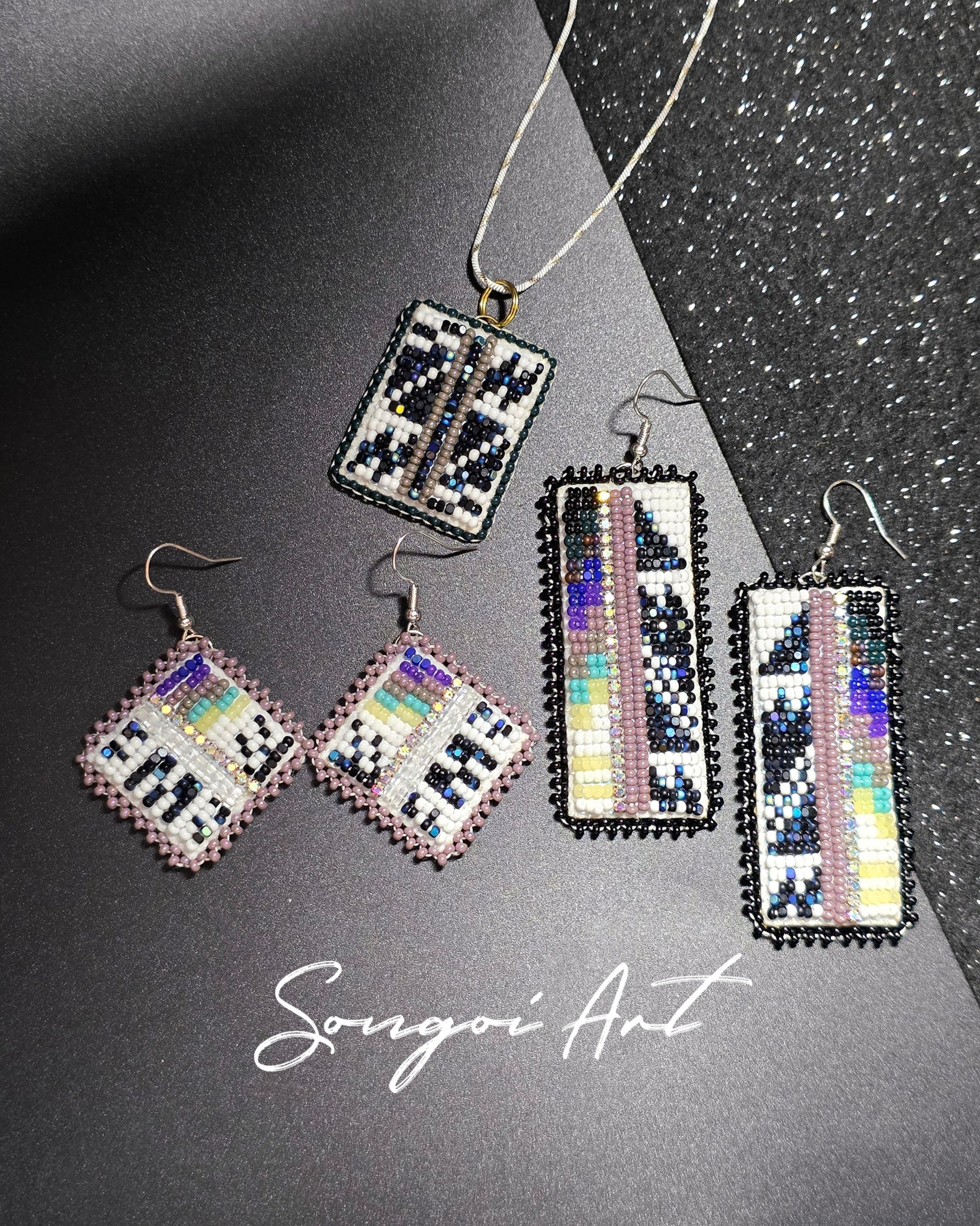 The Celestial Dream: A high-contrast beadwork collection inspired by the night sky's most beautiful displays. Shades of deep purple, royal blue, and turquoise blend effortlessly with geometric patterns.