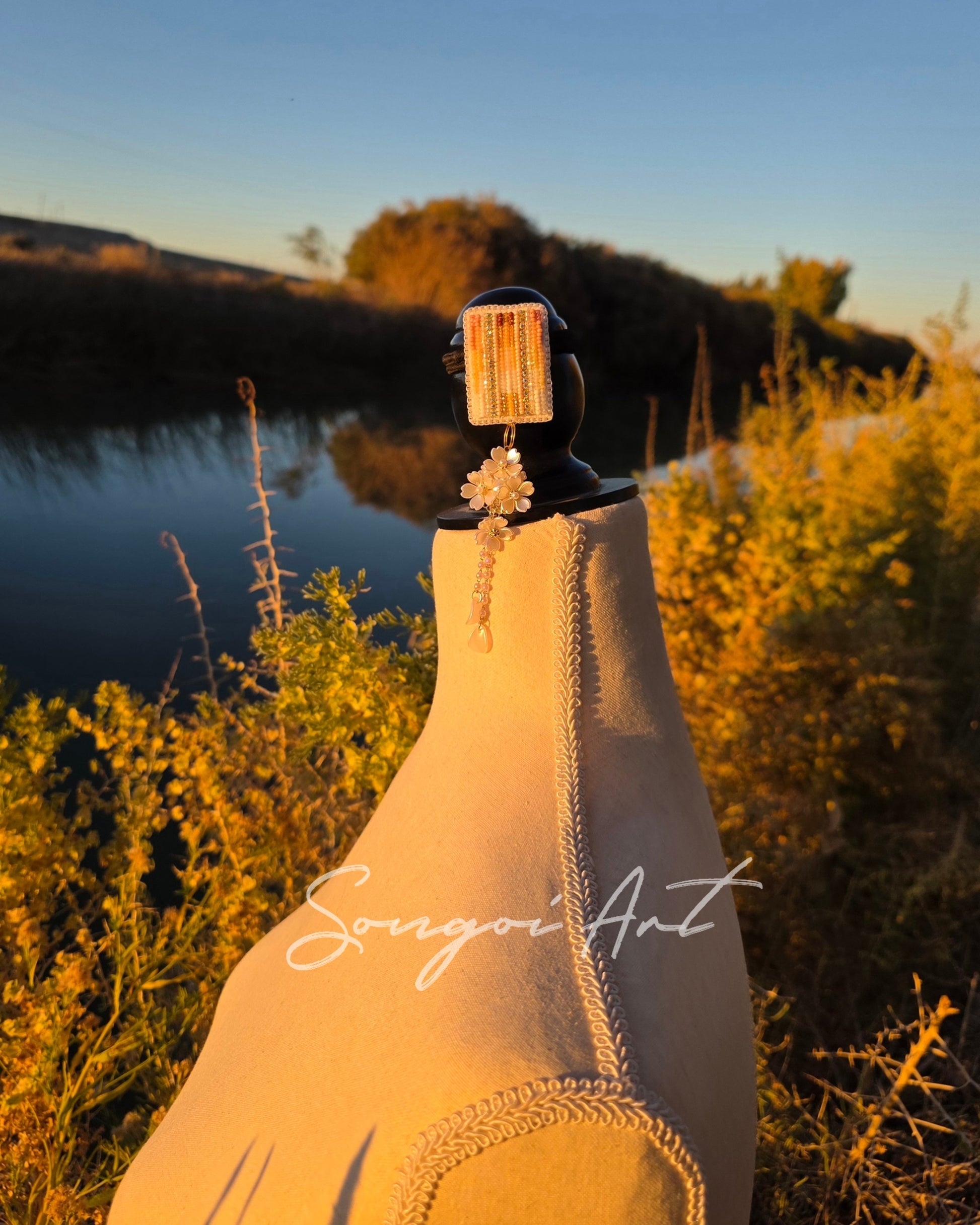 High detail, hand-stitched beadwork that feels as beautiful as it looks. Combining earth tones with delicate pearl beads. Each piece blends intricate geometric with soft elegance, especially made for you to love and enjoy.